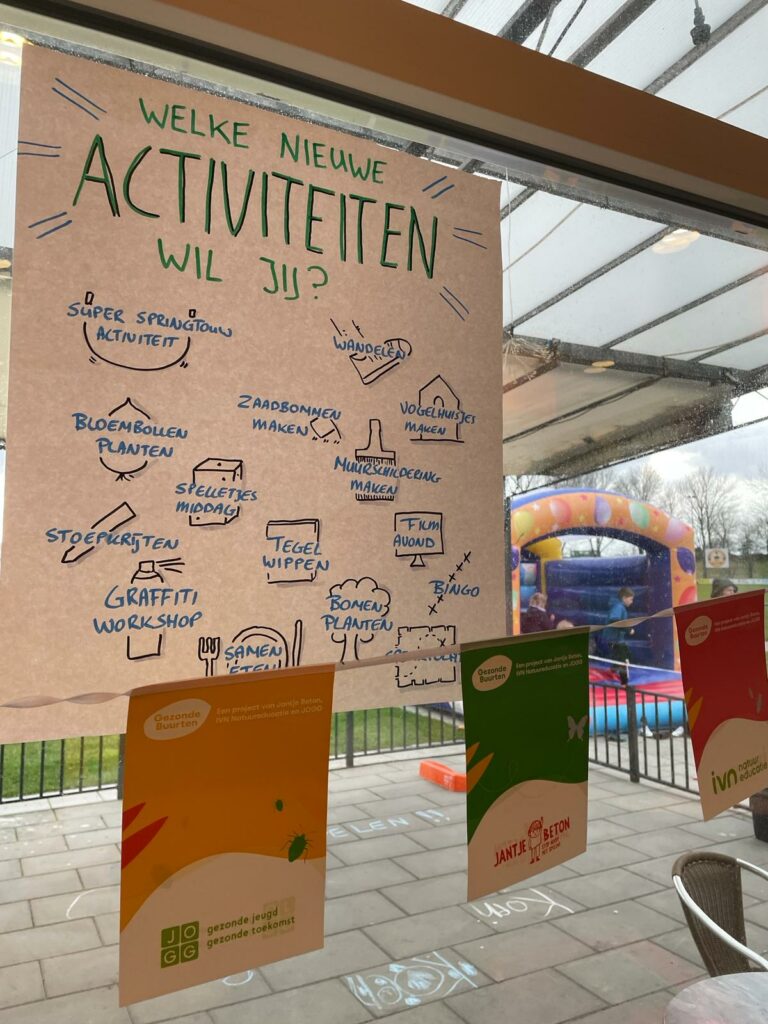 Er zijn door bewoners wel 49 ideeën voor nieuwe activiteiten gegeven. Hieronder een greep uit deze activiteiten. Voor volwassenen: wandelen, cross-fit en trimmen. Voor ouderen: fysio, rolatorwandelen, maatjes, tai-chi en sjoelen. Voor kinderen: hutten bouwen, poldersport en freerunnen. En ideeën voor iedereen: Soep voor de buurt, klussen met handige mannen, repair café en kunst voor de buurt. Het belangrijkste om rekening mee te houden is dat nieuwe activiteiten geen deelnemers wegtrekken van bestaande activiteiten.