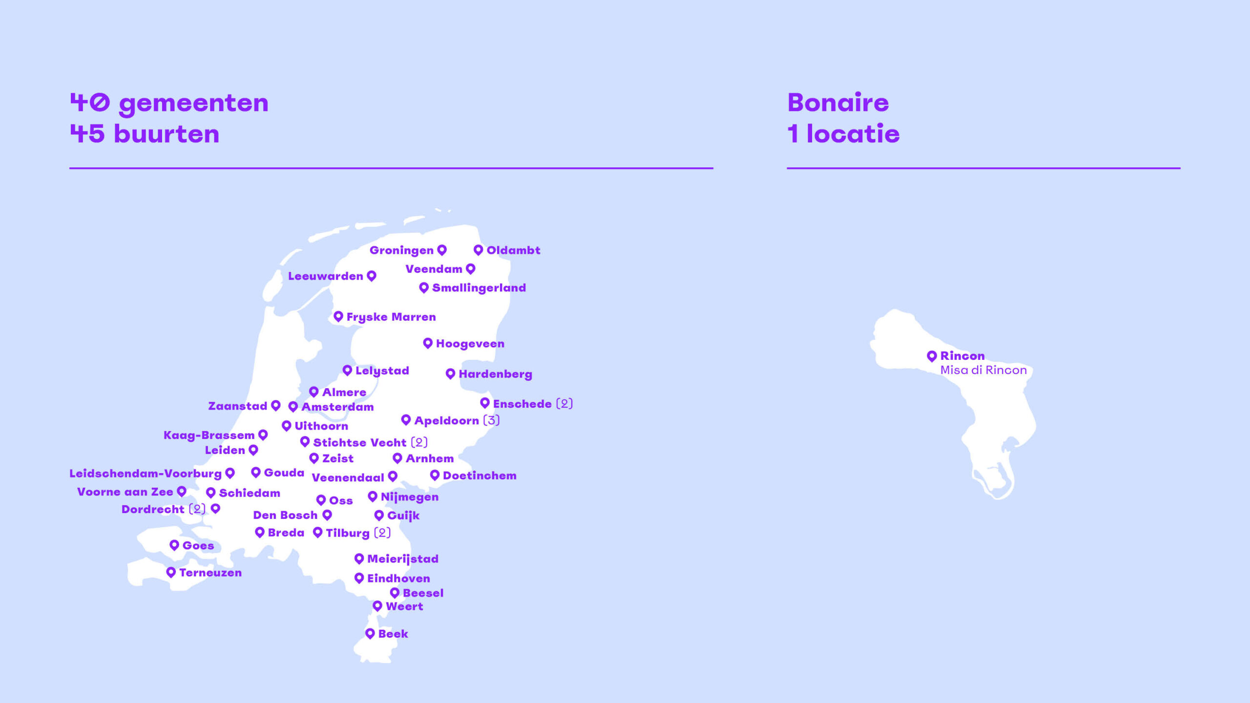 Er zijn op dit moment al bijna 50 Gezonde Buurten. Hieronder zie je een kaart met alle Gezonde Buurten in Nederland en één op Bonaire.