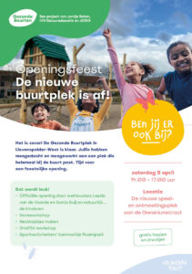 5 april 2025 was de officiële opening van de nieuwe, groene speel en ontmoetingsplek van de buurt. Met een knal van het confettikanon met bloemzaadjes, openden wethouders Laszlo van de Voorde (Wet maatschappelijke ondersteuning) en Sonja Suij (Jeugd) samen met buurtkinderen de Gezonde Buurt-plek.