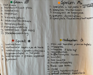 Afgelopen december 2023 zijn we gestart met het samenbrengen van alle partijen die lokaal actief zijn in de buurt. Van buurtsportcoach tot wijkmanager en het voedselbos tot woningcorporatie. We hebben met elkaar in kaart gebracht welke plekken en initiatieven er al zijn in de buurt op gebied van ontmoeting, spelen, sporten en natuur. Met een mooi gevulde buurtkaart tot gevolg. Nu is het aan de buurt om te bepalen welke locaties de meeste potentie hebben om een groene, speelse en sportieve ontmoetingsplek van te maken.
