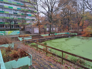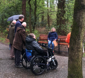 We startten de wandeling bij de ingang van het park Vollenhove naast de weggeefwinkel. De bewoners zouden hier graag een bredere en duidelijker ingang zien, met wellicht ook een toegangsbord en meer kleur door bloemen. De bankjes langs het pad en het pad zelf kunnen beter toegankelijk gemaakt worden. Op de grote speelplek in het park waren de meeste volwassenen het eens met de eerdere opmerkingen van de kinderen; de kabelbaan is heel populair maar de zandbak is vies. De kinderen zouden graag meer willen klimmen en schommelen. Voor de ouders is een fijne zitplek bij de speelplek belangrijk, waarbij ook het pad ernaartoe en de ondergrond van de speeltoestellen zoveel mogelijk toegankelijk zijn. Door naar ’t Volle Bos, waar de groengroep hard aan heeft gewerkt en trots over verteld. Een fijne plek om rustig te zitten ook. Al is niet bij iedereen bekend dat je hierin mag. Een ingangsbord, een breder hek en een lagere heg worden genoemd als verbeterpunten. Vervolgens de zitplekken aan de vijver; daar is eigenlijk niemand positief over; de bankjes zijn vies, de tegels glad en het water erg vervuild met afval en kroos. Deze plek heeft wel potentie maar het is moeilijk om hier een voorstelling van de maken. Als laatste stopplek de groenranden langs de flats. Ook hier zouden de bewoners graag meer kleurige bloemen zien en een route met natuurweetjes wordt ook geopperd.