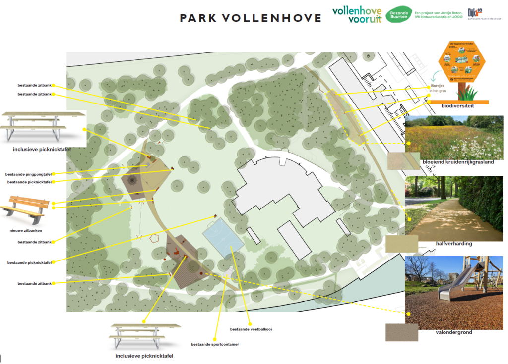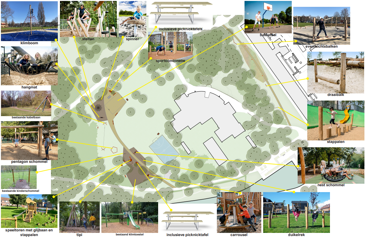 Veel buurtbewoners en kinderen hebben meegedacht over het ontwerp met meer ruimte voor ontmoeting, spelen, sporten en natuurbeleving. Er is goed geluisterd naar de wensen van de buurt. Er komen verschillende nieuwe speeltoestellen bij. Zo komt er een klimboom. Ook komen er schommels om samen te schommelen. Voor de jonge kinderen komt er een speeltoren met glijbaan en stappalen. Ook komt er een tipi en toestellen om mee te draaien. Het bestaande stuk met tegels (links op de kaart) wordt een basketbalveld, zodat de voetbalkooi altijd vrij is om voetbal te spelen. Langs het pad (rechts op de kaart) komt bloeiend kruidenrijk grasland en een beweegroute. We maken de plek af met toegankelijke zitplekken.