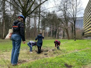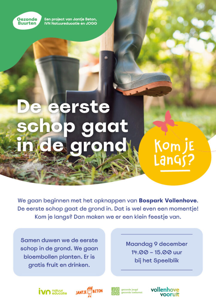 In december 2024 zijn we met behulp van een groep kinderen begonnen met het opknappen van Bospark Vollenhove! De kinderen hebben het startschot gegeven. Samen met de aannemer hebben zij de zandbak alvast weggehaald met scheppen en een graafmachine. En ze hebben biologische bloembollen gepland. De komende weken gaat de aannemer aan de slag met de rest van de speelplek, het pad en al het andere moois uit het ontwerp. Het doel is dat Bospark Vollenhove voor de voorjaarsvakantie klaar is en dat vieren we dan met een feestelijke opening op 21 februari.