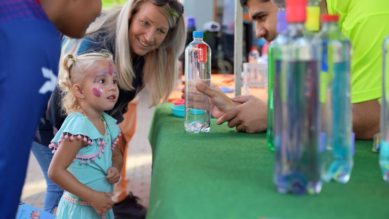 Aan de andere kant van het plein staat het kraampje ‘De droom van de goudvis’. Kinderen met geschminkte gezichten doen daar in opperste concentratie allerlei proefjes met flessen die zijn gevuld met kleurige vloeistoffen. Ze worden daarbij begeleid door Muhammet Bilgic en zijn collega’s van Wavemakers United: ‘We laten met leuke proefjes zien hoe waterdruk werkt. Maar we willen ook meegeven waarom water zo belangrijk is en welke problemen er zijn. Kinderen reageren heel enthousiast en laten de proefjes vol trots aan hun ouders zien.’