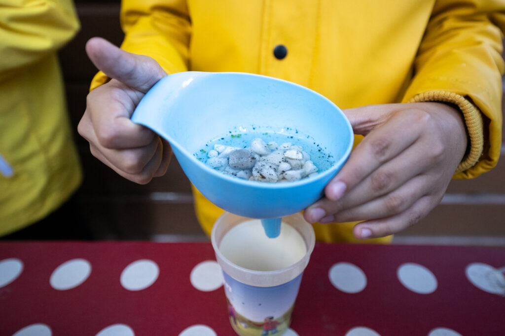 De leerlingen gaan naast afvalscheppen aan de slag met het recyclen van plastic en ze doen proefjes met water. Wat gebeurt er bijvoorbeeld als je een vol glas ondersteboven houdt met een plastic dop ertegenaan? Dat trekt vacuüm! En wat gebeurt er met een aangestoken kaarsje op een bord water als je er een glas op zet? Dat kaarsje gaat zweven! Ze leren ook om zelf water te filteren. Na een leerzame middag krijgen de kinderen een cadeautje mee: een zandloper waarmee ze een wedstrijdje kunnen doen met hun broertjes of zusjes: wie lukt het om binnen vijf minuten te douchen? Een van de leerlingen weet er wel raad mee: ‘Ik win zeker van mijn zus, want zij doucht altijd heel lang.’