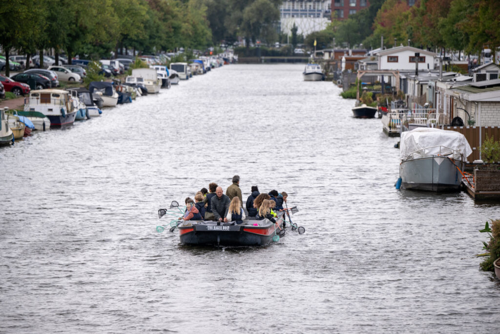 25 achtstegroepers zitten op de langwerpige banken van de boot van kapitein Jan. In het midden liggen de schepnetten en grijpers klaar. ‘Plastic in het water is slecht voor het milieu’, vertelt Jan. ‘Dat blijft niet in het water, maar het gaat de zee in. En dan denk je misschien, waarom is dat erg? Nou, de visjes eten alles op wat ze zien, ook plastic.’ Doel van de boottocht: afval uit het water vissen. De leerlingen speuren om zich heen. Al snel zien ze een plastic zakje, onder luid gejoel wordt dat naar binnen geschept. ‘Kijk’, roept een meisje, terwijl ze naar de oever wijst. Daar ligt een slaapzak, helaas te groot en te ver voor de grijper.
