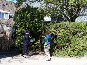 Voor de laatste oefening, de ‘grote opdracht’, had Linda op allerlei plekken afbeeldingen van vogels opgehangen: in de ligusterheg, aan het hek, in een boom. “Ik heb tien verschillende vogels op het schoolplein verstopt”, zei Linda. Ze gaf de kinderen per tweetal een bakje met dezelfde vogelplaatjes. “Als jullie bijvoorbeeld de mus hebben gevonden, leggen jullie het plaatje met de mus in het bakje bij de grote afbeelding.” De diverse groene plekjes met struiken en heggen op het schoolplein maakten de speurtocht extra spannend. Linda wist zeker dat de kinderen na vandaag vaker in de lucht zouden kijken: “Op zoek naar vogels!”