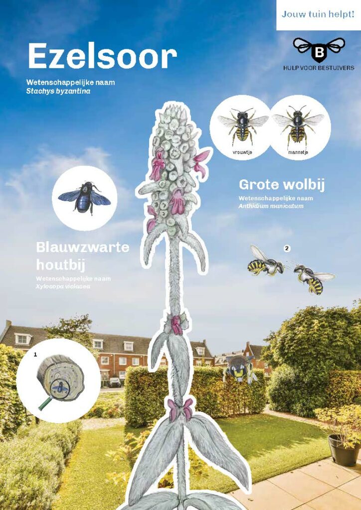 Op elke poster staat één plant centraal, zoals de wilg, ezelsoor en grote kattenstaart. Ook is uitgelicht welke bij je kunt aantrekken met die planten. Wilgen zijn bijvoorbeeld belangrijk voor hommels, maar ook voor zandbijen zoals het roodgatje. Met ezelsoor kun je weer andere wilde bijen aantrekken, zoals de grote wolbij en de blauwzwarte houtbij.