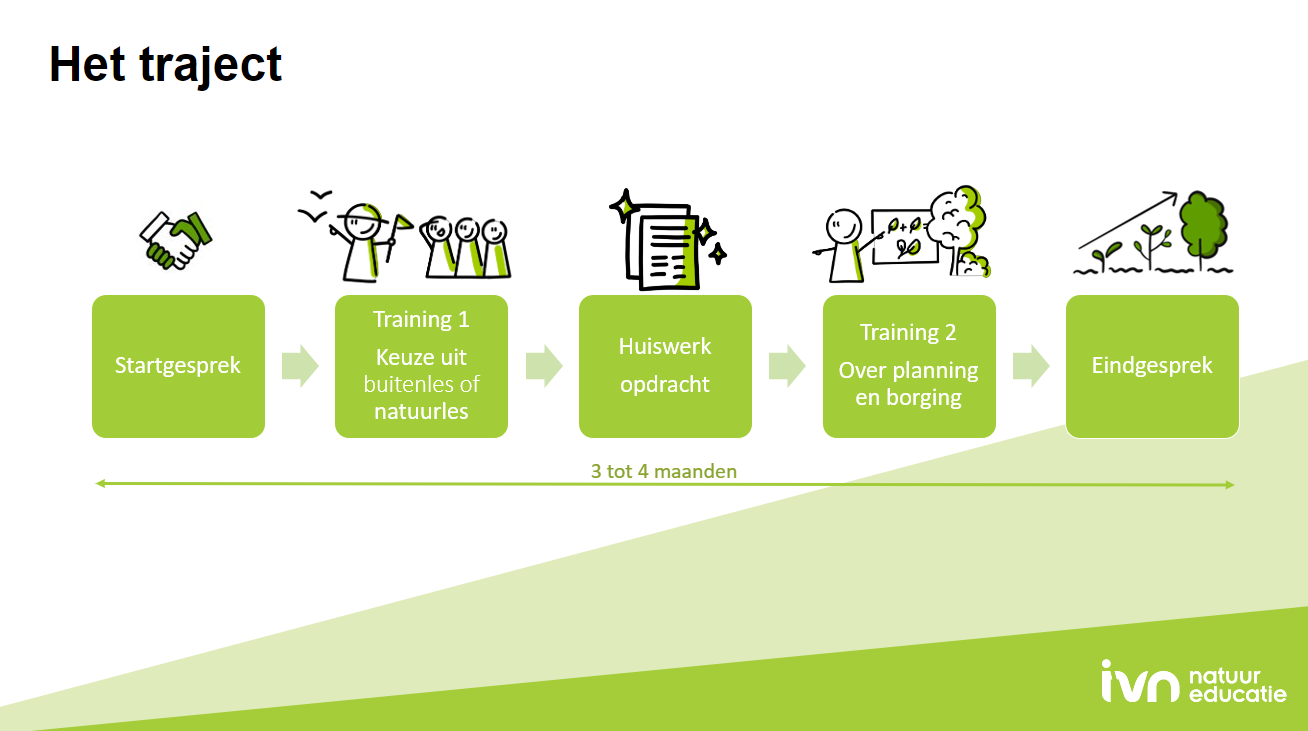 ‘Je buitenruimte als rijke leeromgeving’ is een op maat gemaakt scholingstraject van 3 tot 4 maanden om het educatieve gebruik van het (groene) schoolplein verder te stimuleren en dit structureel in te bedden in het lesprogramma. Het bestaat uit een intakegesprek, twee workshops voor het hele leerkrachtenteam, huiswerkopdrachten en een eindgesprek. Een projectleider van IVN Natuureducatie bepaalt samen met jullie de invulling van het traject. Na dit traject weet elke leerkracht hoe je in elk seizoen in de eigen schoolomgeving aan de slag kan met natuuronderwijs of andere vakken.