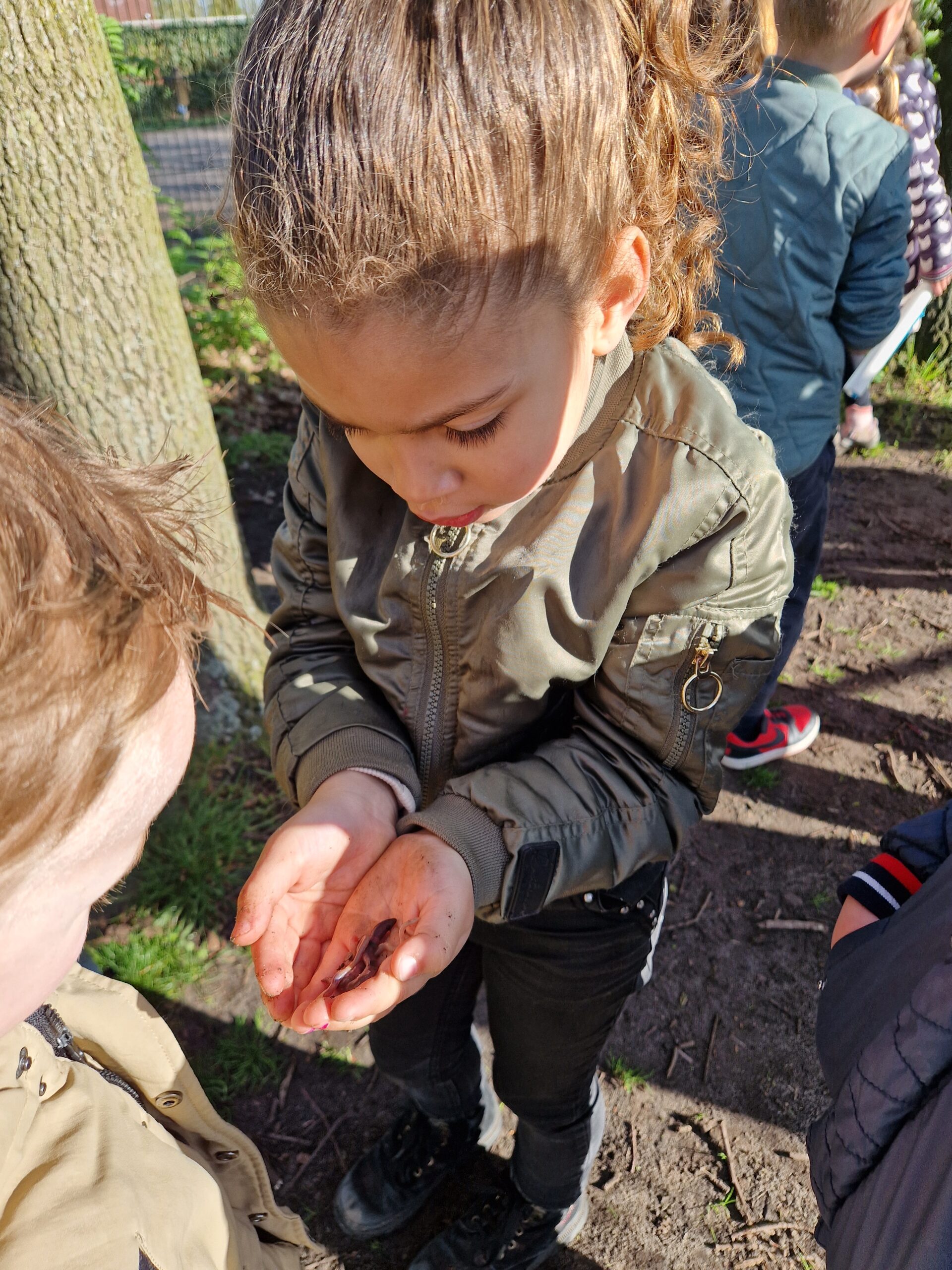 Tim vertelt: ‘Op dit groene schoolplein kun je je heel goed verstoppen, weet je wie dat nog meer doen? Dieren! Kom, we gaan ze zoeken!’ Dolenthousiast gaan de leerlingen aan de slag. Ze weten wel waar ze moeten zoeken, in het bosje bij hun school. Er wordt van alles ontdekt; wormen, pissebedden, mieren, kevers, slakken. Boswachter Tim is super trots op de leerlingen. Ze durfden uiteindelijk allemaal een kriebeldiertje te pakken en vast te houden. Buiten verleggen de leerlingen hun grenzen en raken verwonderd door de bijzondere vondsten op hun eigen schoolplein. Amber (groep 2): ‘We blijven heel lang buiten! We gaan allemaal dieren zoeken met boswachter Tim. Het is een speurtocht!’
