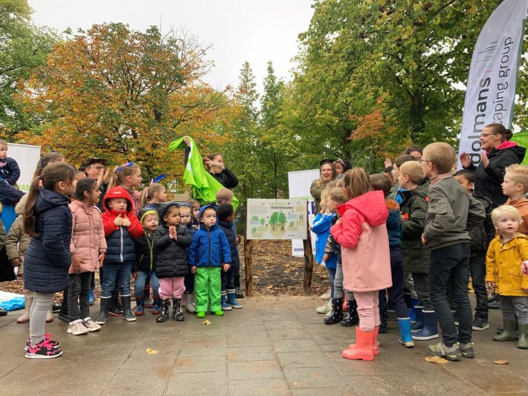 Na een feestelijke opening van het bos volgt een plantinstructie van hovenier Jan, die als erkend Tiny Forest hovenier werkt bij Dolmans Landscaping. Een groep kinderen van zeven tot twaalf jaar luistert aandachtig naar hem. ‘Wat heb je nodig om bomen te planten’, vraagt hij? ‘Een boom’, ‘een schep’, ‘spierballen’, roepen de kinderen. ‘Moet een boom zo in de grond?’, vraagt Jan terwijl hij de boom ondersteboven houdt. ‘Neeee’, joelen en lachen de kinderen. Dan is het tijd voor het echte werk: de bomen mogen de grond in.
