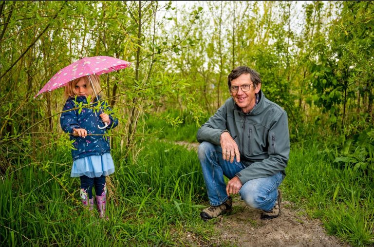 Terwijl opa Wim uitlegt wat er allemaal leeft en groeit in het minibos, begint het flink te regenen. Kleine Ylva blijkt goed voorbereid, ze heeft haar roze paraplu meegenomen en roze regenlaarsjes aan. Een groepje kinderen, met capuchons op, rent door de regen naar het tiny forest. Fenne, Yfke en Brent Rijlaarsdam wonen in de wijk en hebben bezoek van neef Storm en nichtje Doutzen uit Friesland. ,,Wij komen hier wel vaker”, vertelt Fenne. ,,Er is hier een leuk paadje met boomstammen.”