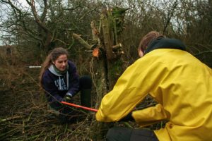 Luthien (links) aan het zagen. Tijdens WoesteLand activiteiten ga je altijd de natuur in en werk je aan natuurbehoud -en herstel. Ieder landschap vraagt weer om een andere aanpak, zoals zagen en steken, strandjutten of exoten bestrijden.
