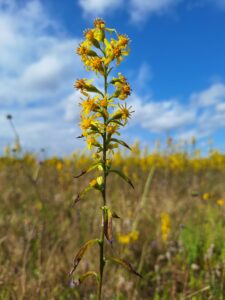 Dan naar een open veld, dat jaren geleden al is ingezaaid met een bloemenmengsel. Als je op je knieën ging zitten zag je gele en blauwe wazen. Het blauw was van de Blauwe knoop (met ook witte exemplaren ertussen, zie foto bovenaan) en het geel van Echte guldenroede.