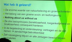 Genoeg stof tot nadenken. Allemaal zaken die meegenomen zouden kunnen worden bij het ontwerpen van een groene leefomgeving. Zeker bij zorgcentra waar ook vaak mensen kampen met visuele problemen. Of bij natuurplekken zoals ons vlinderkamp, wat zouden we zelf kunnen doen? Hoe zorg je dat ook mensen met een visuele beperking natuur dichtbij kunnen beleven in natuurgebieden? En ook: hoe nodig je ziende mensen uit om de natuur op andere manieren waar te nemen dan alleen door vluchtig kijken?
