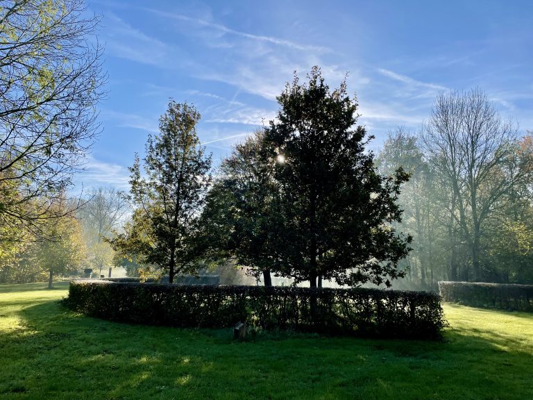 Kerndeel met vrijstaande bomen en halfcirkelvormige hagen