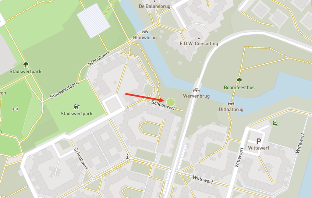 De boom staat in Almere Haven, achter de woningen aan de Schoolwerf, in een groenstrookje tussen de woningen en de gracht. De boom torent hoog en breed boven de woningen uit en is daardoor makkelijk te herkennen.