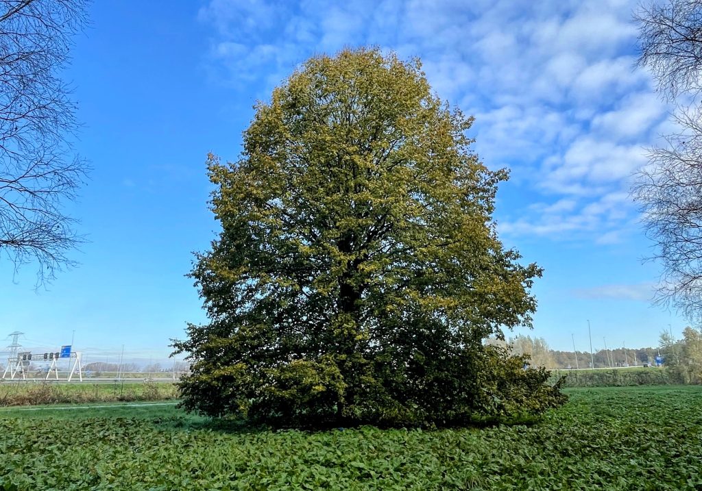 Deze wel heel mooie vrijstaande en uitgegroeide linde staat naast het Farflerpad (fietspad) in het Beginbos. Het Beginbos heet zo omdat het het allereerste – in 1973 – aangeplante bos betreft van Almere en hier met de bouw van het eerste Almeerse stadsdeel (Almere Haven) is begonnen.