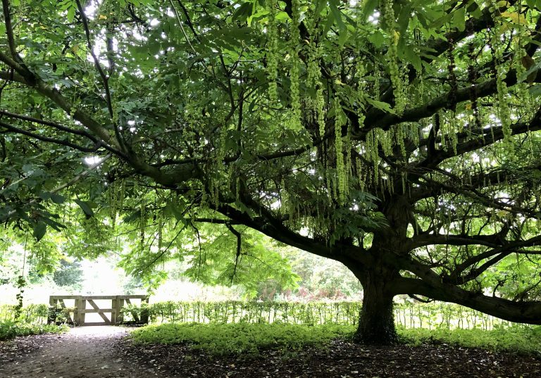 Het is een zeer karakteristieke boom met een lage, zeer lange tak die ondersteuning nodig heeft van een houten stellage. Het voetpad loopt onder de lage tak door, bukken is dus het devies.