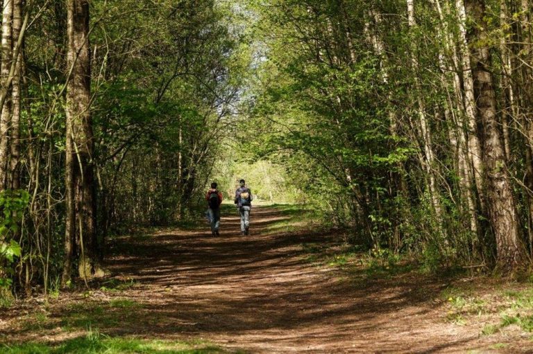 Twee mensen wandelen over een bospad omringd door groene bomen.