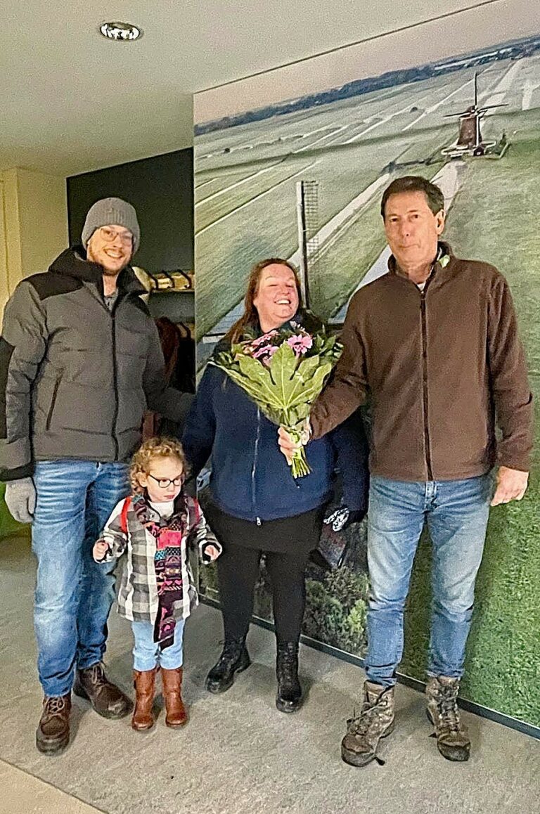 Fotoschrift: De familie Leechburch Auwers uit Driebruggen krijgt als 50.000e bezoeker uit handen van bestuurslid Stef Strik van bezoekerscentrum de Veenweiden een bos bloemen.