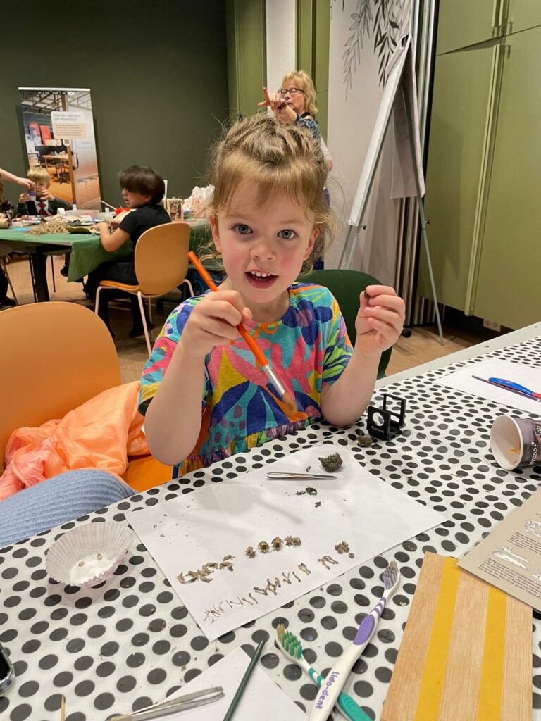 Wilma Verver en Hans van Dam, waren aanwezig om te vertellen over het belang van een gezonde natuur. Boven in de grote ruimte waren de kinderactiviteiten. Herbruik je jeans en maak er iets leuks en nuttigs van, schminken, maak je eigen snoepverpakking of insectenhotel. En bij het IVN mochten de kinderen braakballen van uilen pluizen. En de hele dag was de tafel bezet door ouders en kinderen. Wat een ontdekking dat een muis echt dezelfde botten heeft als een mens en zelfs in aantal nog meer. Ook kon je goed het spaak- en scheenbeen zien, maar ook het knobbelgewricht bij de heupen.