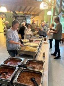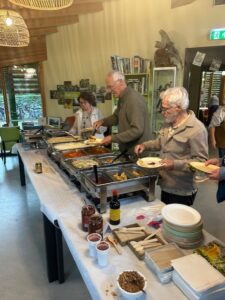 Het was een droge middag en zelfs nog een klein uurtje een zonnetje, zodat velen buiten hebben kunnen zitten en genieten van het buffet. Het buffet bestond voor een groot deel uit vegetarische gerechten en was aangevuld, voor de “carnivoren”, met saté en babi pangang. Het was een gezellige middag en er was voor eenieder ruim voldoende eten en drinken. We kunnen terugkijken op een geslaagde bijeenkomst.