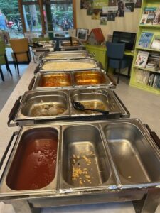 Het was een droge middag en zelfs nog een klein uurtje een zonnetje, zodat velen buiten hebben kunnen zitten en genieten van het buffet. Het buffet bestond voor een groot deel uit vegetarische gerechten en was aangevuld, voor de “carnivoren”, met saté en babi pangang. Het was een gezellige middag en er was voor eenieder ruim voldoende eten en drinken. We kunnen terugkijken op een geslaagde bijeenkomst.