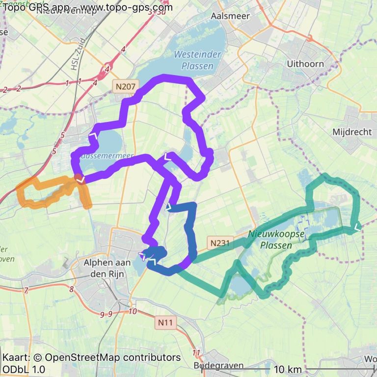 Al fietsend krijg je een indruk van wat het water en het landschap van de Rijn- en Veenstreek aan historie, natuurschoon en vermaak te bieden hebben. Variatie genoeg. De start is bij het Bezoekerscentrum De Veenweiden bij de vrij ‘jonge’ uitgebaggerde Zegerplas in het tot Prinses IreneBos omgedoopte gebied, voorheen Zegersloot-Noord genoemd. Vervolgens ga je via het eeuwenoude natuurlijke Braassemermeer richting Aalsmeer, langs de Westeinder Plas, Langeraarse Plassen en weer terug naar Alphen langs de Noordense en Nieuwkoopse Plassen.