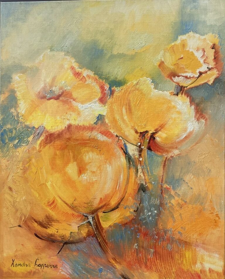 Een schilderwijze die risico inhoudt: als de kleuren verkeerd mengen en vertroebelen, moet ze opnieuw beginnen. Hoewel je wel kunt zien welke bloemen Xandra schilderde, streeft zij niet naar het weergeven van een fotografische realiteit. “Ik wil een impressie geven, ik ben heel emotioneel. Als ik in een lieve bui bent dan ontstaat zacht en teder werk. Maar een andere keer geef ik meer kracht, waardoor het werk naar het surrealistische neigt.