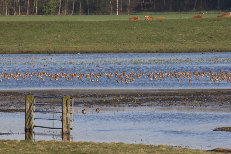 Een maand geleden beschreef Aleid in deze rubriek de aankomst van de eerste grutto’s; op het moment dat u dit leest zijn er duizenden aanwezig. Deze vogels komen op krachten na de trek uit Afrika en Zuid-Europa, dankzij het voedsel dat zij met hun lange snavels uit de rijk voorziene modder kunnen peuren. Voor grutto’s is het een toplocatie: in de Vogelbalans 2014 van Sovon Vogelonderzoek Nederland staat het genoemd als de grootste slaapplaats voor grutto’s: “Het Landje van Geijsel (NH) is vermaard, maar eigenlijk ‘zomaar’ een stuk grasland dat elk jaar plas-dras wordt gezet. Dat levert regelmatig meer dan 1000 slapende grutto’s op, in maart 2013 zelfs 6100.”