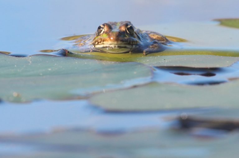 Half maart is het opeens voorjaar in de vijver. Eerst zie ik één bruine kikker, de volgende dag een paar, de dag daarna tien en binnen een dag of vijf zie ik er wel veertig. Waar ze allemaal vandaan komen is moeilijk na te gaan. ’s Winters vind ik er weleens één onder een stuk hout of een steen. Of ze net als groene kikkers ook op de bodem van de vijver overwinteren, is moeilijk na te gaan.