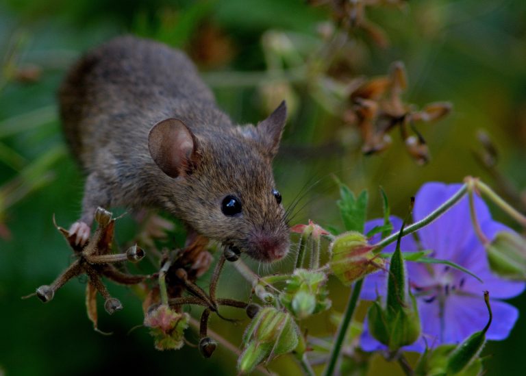Het is hoog zomer. Er scharrelen muizen rond in onze tuin. De grote hoop stenen in het midden van de tuin is kennelijk een goed leefgebied voor de muizen. Dit voorjaar zag ik af en toe wel een muis wegschieten, maar de laatste dagen komen ze steeds meer uit hun dekking. Dat heeft alles te maken met het enorme voedselaanbod. Een flink aantal planten is uitgebloeid en heeft zaad gezet. De Beemdooievaarsbek was de eerste plant waar we muizen in zagen foerageren. Als ware evenwichtskunstenaars klimmen de muizen over de plantenstengels naar boven om een zaaddoos te bemachtigen, die bijna zo groot is als de muizen zelf. Soms vallen ze met buit en al naar beneden, maar dat lijkt ze niet te deren. Even later zie ik de plantenstengels opnieuw heen en weer trillen en klimt de muis, of een familielid, weer naar boven. Ze lijken langzaamaan hun natuurlijke schuwheid te overwinnen en we kunnen ze tot op enkele meters naderen met het fototoestel en de filmcamera in de hand. Het gaat hier om huismuizen, die we inderdaad ’s winters wel eens in de kamer weg zien schieten. Omdat we zo dichtbij kunnen komen zien we dat de muizen witte voetjes hebben. We noemen het mannetje Branko, naar de Kroatische ober die we vorig jaar zomer in Porec tegen kwamen en die bij het diner altijd witte handschoenen droeg. Het vrouwtje noemen Marianka, naar een serveerster uit hetzelfde hotel.