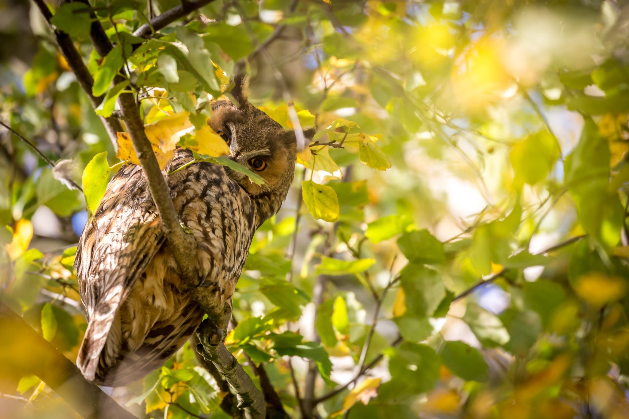 De bruinogige Bosuil jaagt ‘s nachts en de geelogige Velduil overdag, maar de Ransuil met oranje ogen, waar de kat van Baba Yaga jaloers op kan zijn, jaagt in de schemering. De grote groep die nu in die boom zit – een beetje kenner heeft het over roesten – is een allegaartje van uilen die in Amstelveen geboren zijn en uilen die van elders gekomen zijn om hier te overwinteren. Daar kunnen zomaar een paar Scandinaviërs bijzitten, want híer is het in de winter sappelen, maar boven de 60ste breedtegraad is de lol er snel af in dit seizoen. Midden in de bebouwde kom zitten deert ze niet echt: ze zitten niet te wachten op invasieve fotografen, maar ze zijn niet heel erg verstoringsgevoelig. Bovendien vermoed ik dat de voordelen van het stadse leven (minder last van Havik en Bosuil en meer van die lekkere zangvogeltjes) opwegen tegen de nadelen ervan (nieuwsgierige mensen, honden).