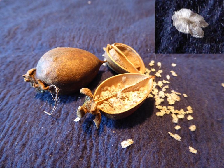 Nu ziet ze er vooral intrigerend uit, de takken behangen met ovaalvormige, houtige vruchten waarin dus een overdaad aan gevleugelde zaadjes.