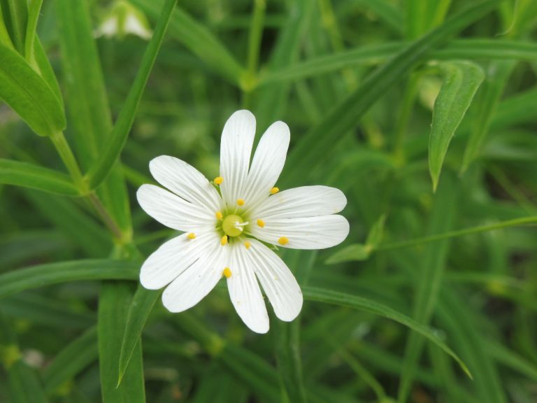 Een prachtige voorjaarsbloeier is de grote muur, voorheen grootbloemige muur. Deze soort komt uit het geslacht muur waarvan de bekendste soort vogelmuur is. Vogelmuur is één van de meest algemene planten, zowel op akkers als ook in de bebouwde kom. Het is een plantje met bladeren die door de meeste vogels graag gegeten worden. Als ik hem in de tuin aantref, geef ik hem aan het konijn. Grote muur komt van nature voor in het zuiden, oosten en noorden van ons land, maar dus niet in Amstelveen. Hij bloeit in het voorjaar met grote witte bloemen die bijna licht lijken te geven als het donker wordt. Soms wordt hij verward met de akkerhoornbloem. Hoornbloemen vormen een ander geslacht binnen dezelfde familie. Het verschil kan je zien aan de vijf kroonbladen. Alle hoornbloemen hebben vijf kroonbladen die nooit verder dan tot op de helft zijn ingesneden. Bij grote muur zijn ze tot iets over de helft ingesneden. Bij alle andere muursoorten zijn de kroonbladen nog dieper ingesneden, bij vogelmuur zelfs zover dat het er tien lijken.
