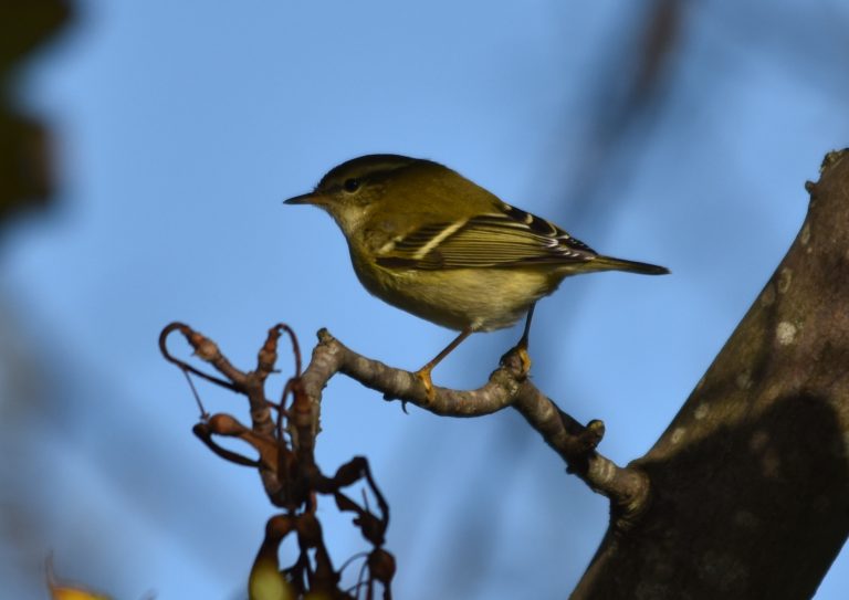 Als andere boszangers (phyllo’s voor intimi) is ze in bezit van een klein, fijn snaveltje, waar ze insecten mee uit de lucht plukt. Boszangers als de tjiftjaf, de fitis en de fluiter broeden in Europa en overwinteren in het Zuiden, boven of onder de Sahara. Aan de volgorde waarin ze terugkeren herken je de seizoenen. Als je de tjiftjaf hoort, is het voorjaar, als je de fitis hoort, is het zomer, de fluiter fietst er achter aan  en hoor je de bladkoning, dan is het herfst. Nu dus. Ieder jaar laat ze zich wel even horen, sommige jaren vaker dan anders. Vroeger een dwaalgast ( gevalletje te harde Oostenwind) nu een regelmatig gehoorde doortrekker, al is er nog veel onbekend over dit vogeltje. Als je de literatuur erop naslaat, dan lijkt het hogere aantal waarnemingen ook samen te hangen met de vergrote kennis van vogels en de verbeterde apparatuur. Je vraagt je dan meteen af wat er nog meer rondvliegt en rondkruipt waarvan we nu niet eens weten dat het bestaat!