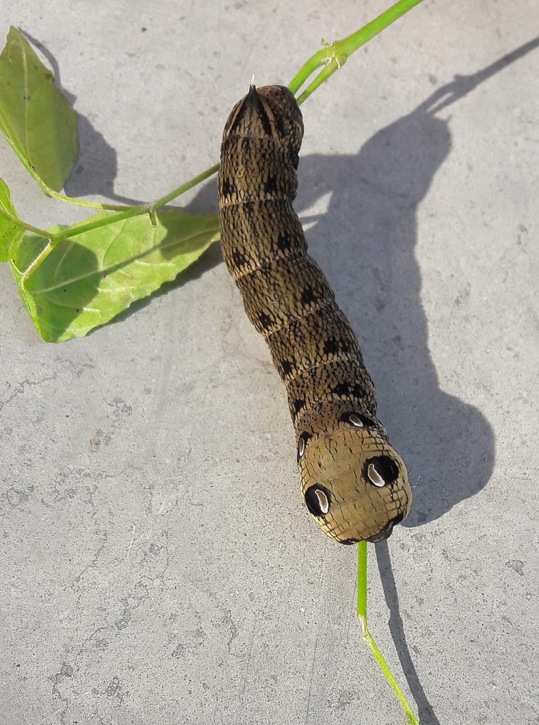 avn olifantrupsVorige week zag ik dat buurkat Moos sterk gefocust was op een plekje tussen de planten. Toen ik eens goed ging kijken, zag ik twee grote ogen die me aanstaarden. Het waren de zogenaamde schijnogen van een enorme rups. Eerst heb ik de rups in veiligheid gebracht, buiten het bereik van de nieuwsgierige kat, toen ben ik gaan zoeken wat voor soort rups het was. De mobiele telefoon met een zoekapp leverde al snel de naam Olifantsrups op en volgens de insectengids zou deze rups uitgroeien tot een wel heel aparte nachtvlinder: Avondrood. Overigens zijn die schijnogen van de rups bedoeld om eventuele roofdieren af te schrikken, een techniek waar ook vele andere vlindersoorten zich van bedienen, denk maar eens aan de Dagpauwoog. Vorig jaar herfst stroomden mijn paddenstoelenhobby en mijn insectenliefhebberij samen. Op een Grote stinkzwam filmde ik een Keizersvlieg, die zich tegoed deed aan het zoete groene goedje op de hoed van de paddenstoel. De vlieg verspreidt hiermee de sporen, die aan zijn poten blijven kleven.