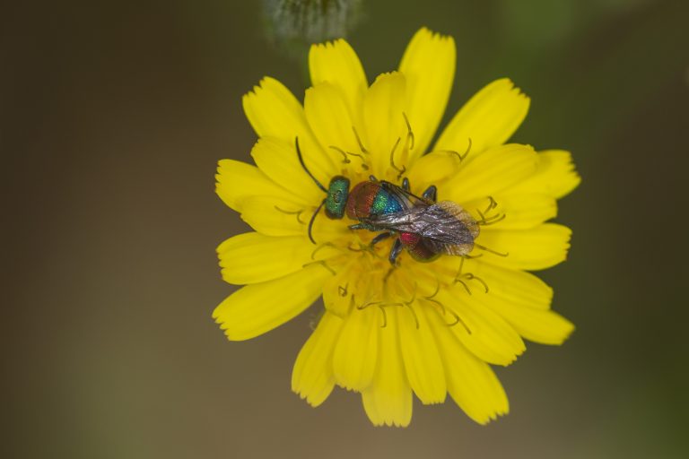 Een paar jaar geleden werd er een nieuwe goudwesp voor Nederland gevonden. Nog niet eerder hier vertoond. Zo kleurrijk dat het Jeugdjournaal er aandacht aan besloot te geven. Een van de redacteuren kwam met de naam Regenbooggoudwesp aanzetten, vanwege, men raadt ‘t vast al, al die verschillende kleuren die het beestje leek uit te stralen.