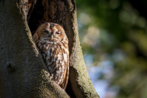Uil rust in holle boom, ogen half gesloten, zonlicht op verenkleed, groene achtergrond. Vogels