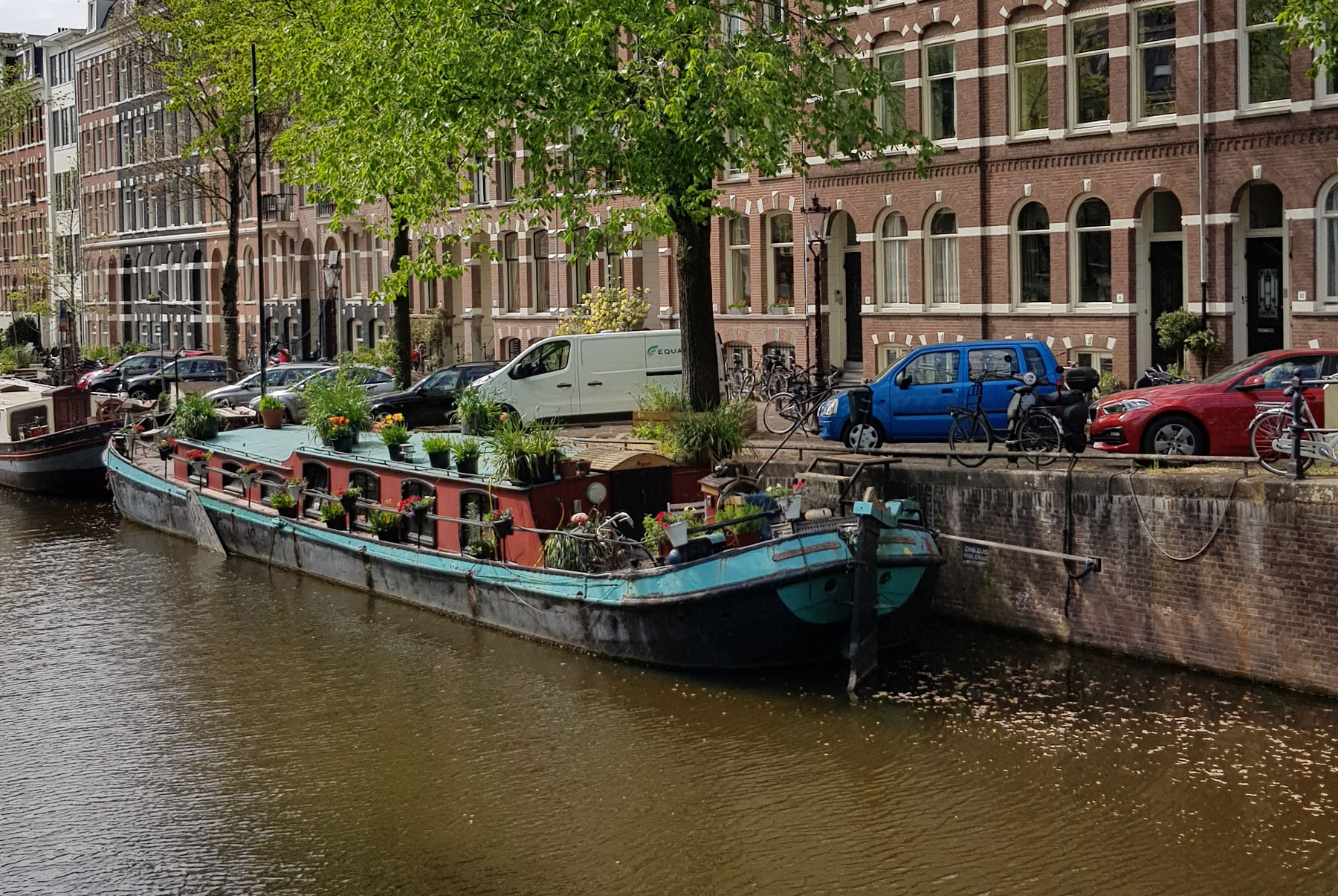 Op weg naar het hoofdkantoor van IVN Natuureducatie (naast Hortus Botanicus). Of het nu gaat om een gezellig vergroende woonboot of een prachtige Amerikaanse sering aan huis, het doet wat goeds met je humeur!