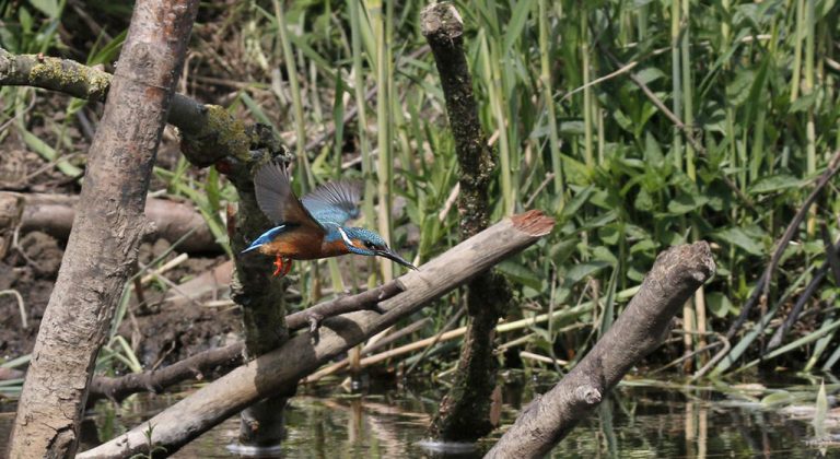 Alinea 1: IJsvogel scheert over het water op Oeverlanden Zuid van de Nieuwe Meer, Roely Bos. Dit is een goede plek om ijsvogels te zien en te horen.