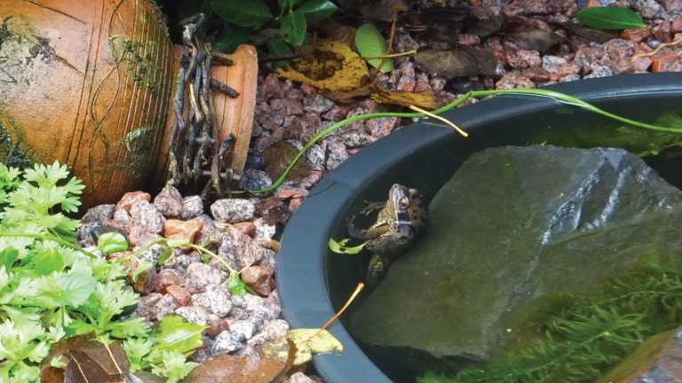 Ja hoor, hoe blij kun je zijn, het was me gewoon gelúkt. Er zat een kikker in de minivijver!