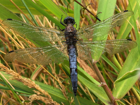 Op een stengel komt hij bij. Klapperend; spetters vliegen in het rond. Een van zijn vleugels is een beetje beschadigd. Beschaamd bedenk ik me dat dat door de sigaar komt, hij ging twee keer kopje onder voor ik hem had. Zou hij nog kunnen vliegen? Hij zit daar maar, vlak voor mijn neus, wrijft met zijn pootjes veelvuldig over zijn immense ogen en draait zijn kop alle kanten op. Ik wil dat hij het overleeft! Ik ga in het gras zitten en houdt de wacht. Ondertussen lees ik op internet over libellen. Het is een gewone oeverlibel. Een mannetje, vanwege zijn matblauwe achterlijf. Het klapperen blijkt goed, dat doet hij om zich op te warmen! In de sloot was hij wellicht onderkoeld geraakt.