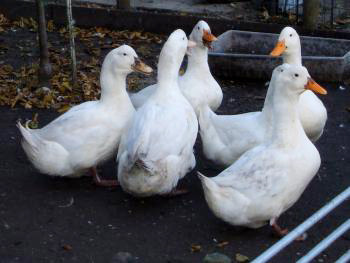 Vlakbij de dierenhokken is een zelfgemaakt bassin met goudvissen. Naast het bassin ligt het veldje van de Indonesische loopeenden. Parmantig stappen ze rond. Wit, met een sierlijke flessenhals. De mannetjes hebben een oranje snavel, de vrouwtjes een bruine. Via een kennis die op een eendenfokkerij werkt, kreeg Jaap de eenden als kuikens. De dieren hebben het goed getroffen op Uilenhof. Dit soort eenden wordt normaliter gefokt voor consumptie. Op de fokkerij zijn ze na zes weken eten en nog eens eten rijp voor de slacht. De Uilenhof-eenden waren na zes weken ook best groot. Maar hun volledige verenpak hadden ze nog niet. Altijd hebben ze honger. Zelf pikken ze wormen, slakken en insecten, Jaap voert ze verschillende soorten graankorrels en wat brood. Terwijl de beesten hongerig dichterbij komen, vraag ik: “Hoe komen jullie er op om hier eenden te houden?” Jaap vertelt: “Loopeenden leggen veel eieren. De dooiers, die groter en vetter zijn dan die van kippeneieren, zijn uitermate geschikt om taarten en cakes van te bakken. Het baksel wordt luchtiger en zachter.” De smaak van deze eieren is anders dan die van kippen. Maar hoe, dat kan hij me niet vertellen. De eenden leggen namelijk nog geen eieren. Ik neem me voor om gauw weer een keer langs te gaan. Hopelijk liggen er dan eieren!