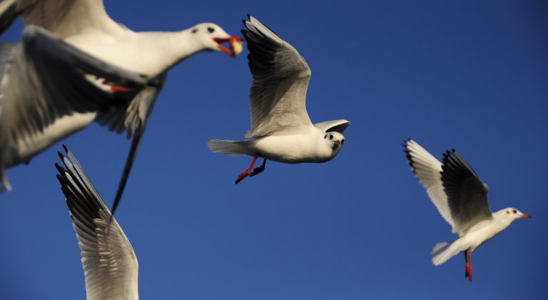 Sinds het winter is, zie en hoor ik opeens veel kokmeeuwen in Amsterdam. Een kleine rumoerige meeuw die je niet over het hoofd kunt zien. Net als jij en ik, en veel andere vogels, draagt de kok- of kapmeeuw ‘s winters een andere jas dan ‘s zomers, of beter: een andere muts. In de zomer draagt hij (om concurrenten te imponeren) een chocoladebruine kap, terwijl hij in de winter slechts twee kleine grijze oorwarmers op zijn kop heeft. In dit wintertenue trekt hij in grote groepen naar de stad. Ze zwemmen in vijvers of vliegen er krijsend boven op zoek naar waterdiertjes en vis. Ook zitten ze op een rijtje op de leuning van een brug of op de rand van een dak, wachtend tot iemand iets eetbaars laat vallen.