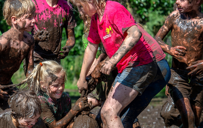 Tijdens de modderdagen (29 juni) veranderen sommige kinderen zelf in modderdiertjes (zie foto).