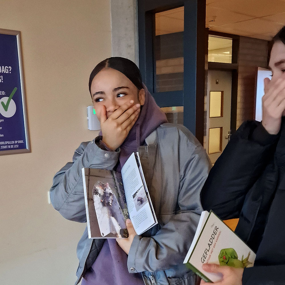 Voor dit deel van de sessie werd het boek Natuur met een knipoog, uit de Gefladder boekenreeks gebruikt. Speciaal hiervoor kregen de leerlingen hun telefoon terug. Met de QR-codes in het boek kunnen namelijk video’s bekeken worden die de verhalen in beweging brengen.