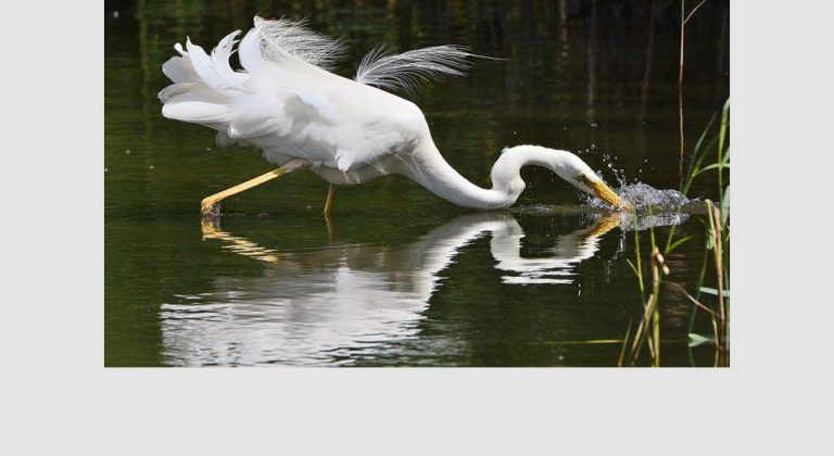 Roerloos loer ik met mijn verrekijker naar de rand van de sloot. Daar staat – net als ik onbewogen – een grote zilverreiger, zijn blik strak op het water gericht. Hij heeft eindeloos geduld, dus ik ook. Zijn zwierige zijden sierpluimen op rug en borst wijzen op het naderende broedseizoen, net als de gedeeltelijk zwarte snavel. Na een spannend lange stilte maakt hij een sprongetje en landt in de sloot, alsof hij gaat zwemmen. Een fractie van een seconde duikt hij met zijn kop onderwater, om weer boven te komen met een vette vis, wel dertig centimeter lang. Geworstel volgt, totdat de vis met kop eerst naar binnen glijdt, door die eindeloos lange keel. Daarna drinkt de zilverreiger een paar slokjes slootwater, schudt zijn voorjaarsveren en gaat weer roerloos op de oever staan.