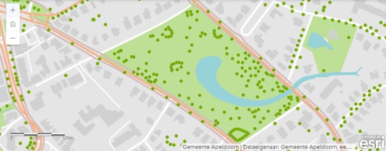 En daarin vind je een link naar het overzicht van de bomen in Apeldoorn, waarbij je tot op de individuele boom kunt inzoomen en o.a. de Latijnse naam ervan kan zien als je op het bolletje klikt
